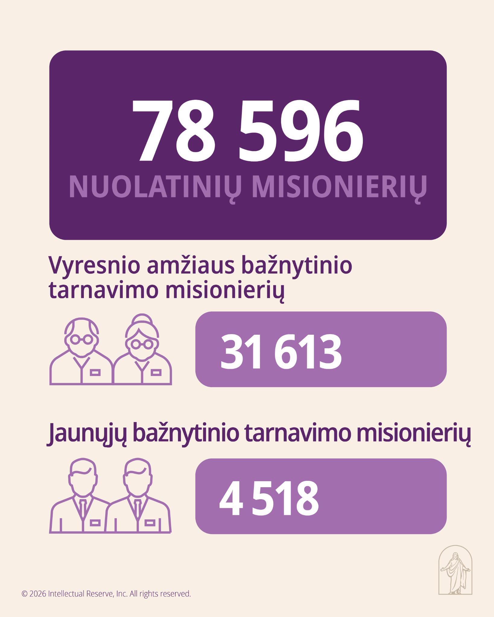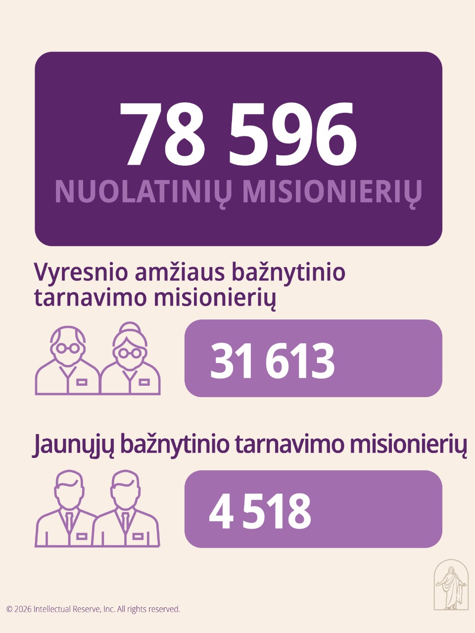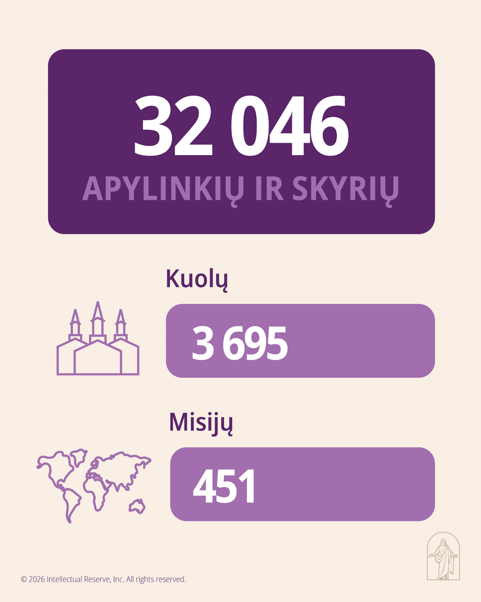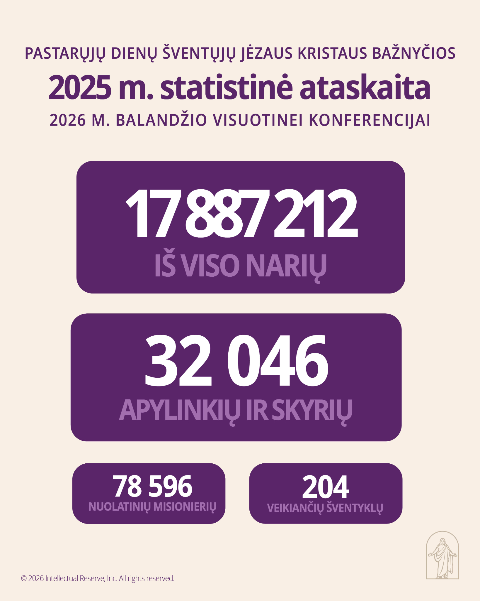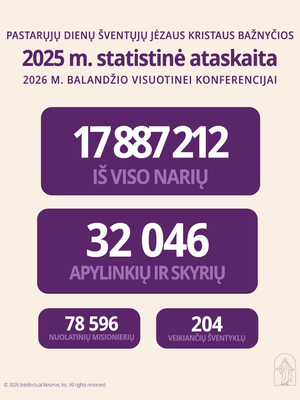 Pirmoji Prezidentūra, norėdama informuoti Bažnyčios narius, išleido tokią statistinę ataskaitą apie Pastarųjų Dienų Šventųjų Jėzaus Kristaus Bažnyčios augimą ir būklę, 2025 m. gruodžio 31 d. duomenimis: